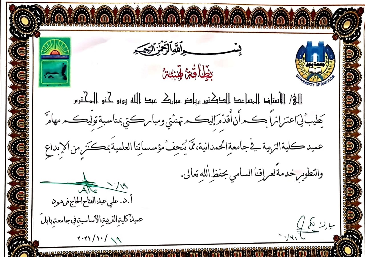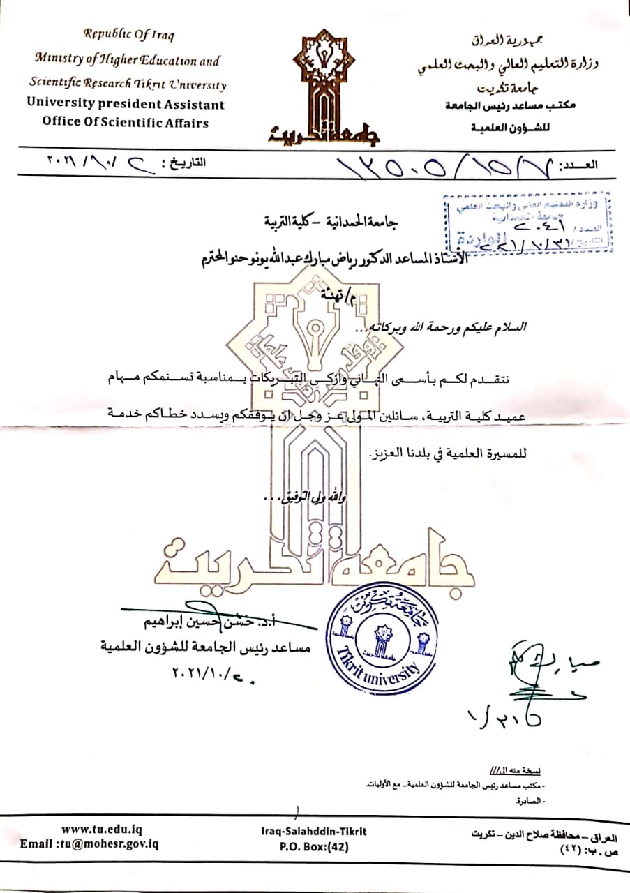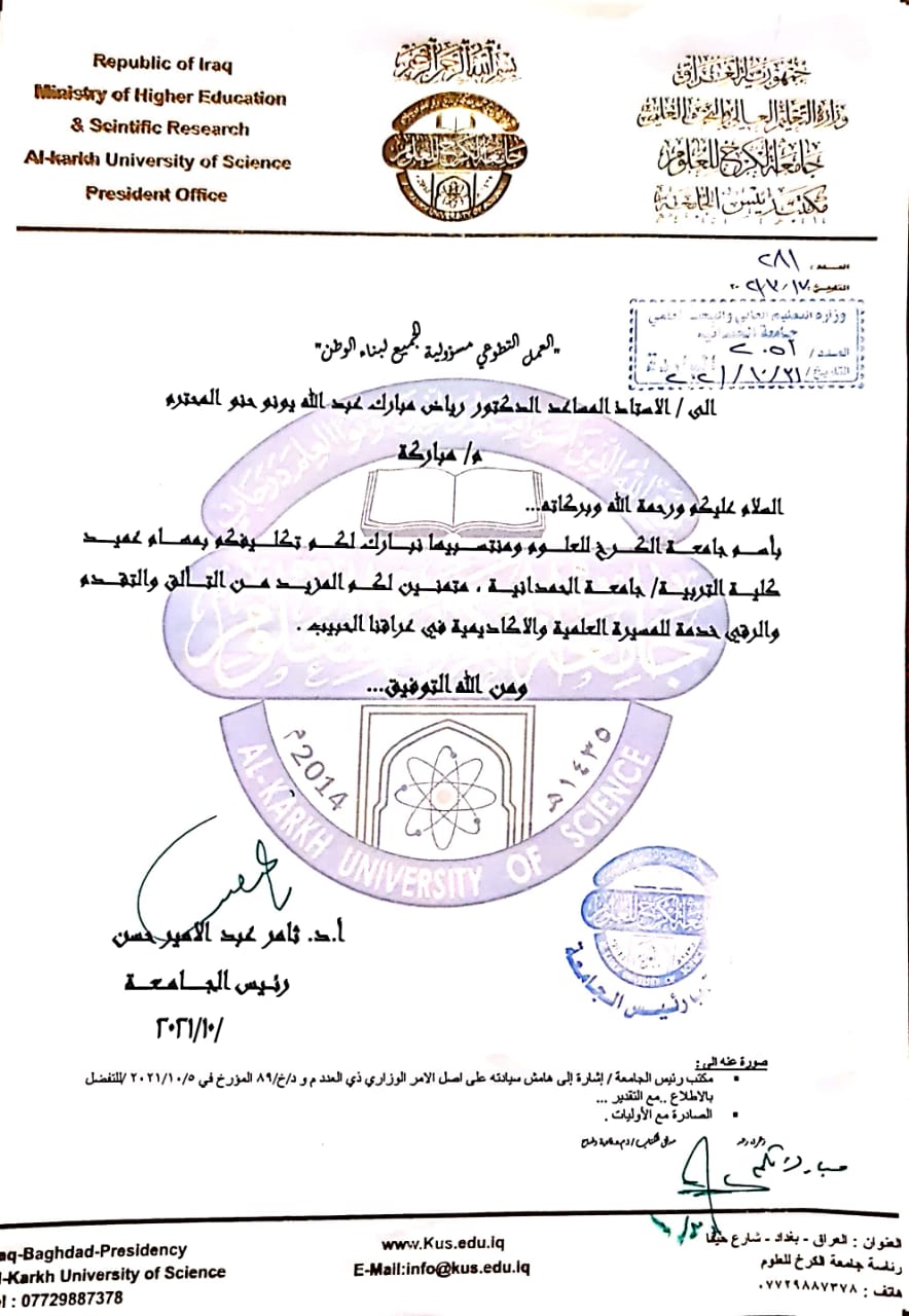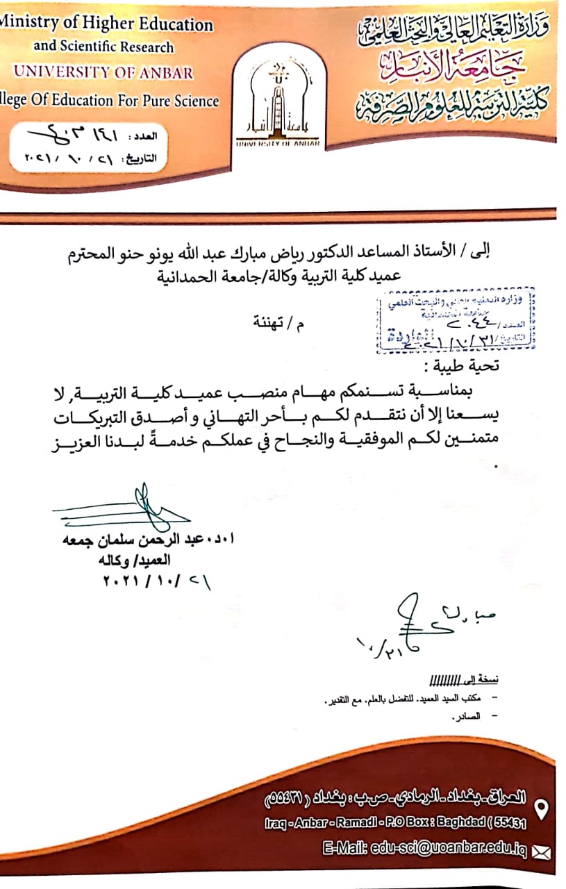 تلقى السيد عميد كلية التربية الدكتور رياض مبارك عبد الله عددا من برقيات التهنئة من مختلف الجامعات العراقية بمناسبة صدرو الأمر الوزاري لتسنمه مهام عميد كلية التربية ، وكان من بين المهنئين السيد رئيس جامعة الكرخ للعلوم والسيد مساعد رئيس جامعة تكريت للشؤون العلمية والسيد عميد كلية التربية بجامعة الانبار والسيد عميد كلية التربية الاساسية بجامعة بابل ، متمنين له كل الموفقية والنجاح في إتمام مهامه .
